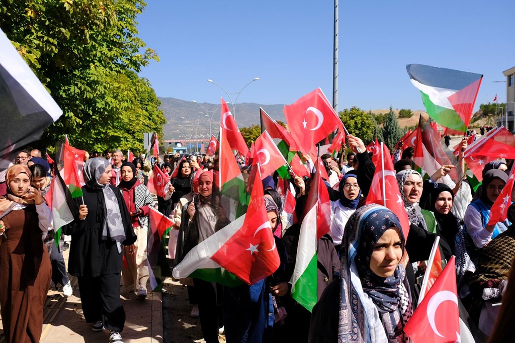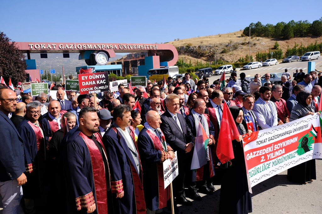 Etkinlikte konuşan Rektörümüz Prof. Dr. Fatih Yılmaz, Gazze’de yaşanan acılara dikkat çekerek şu ifadelere yer verdi: “Bugünkü yürüyüşümüz, sadece bir protesto değil; insanlığın ortak vicdanının sesidir. Gazze’de akan kan durmadıkça, çocuklar açlık ve korku içinde yaşamaya mahkûm oldukça, dünya gerçekten huzura kavuşmayacaktır. Son günlerde Sumud Filosunun cesur ve kararlı çıkışı, vicdan sahibi milyonların umudunu yeniden yeşertmiştir. Bu onurlu girişim, zulme karşı dayanışmanın, sabrın ve direnişin simgesi haline gelmiştir. Bizler de üniversite olarak bu filonun ortaya koyduğu iradeyi yürekten selamlıyor, tüm destekçilerinin yanında olduğumuzu bir kez daha ilan ediyoruz. Biz inanıyoruz ki adalet bir gün mutlaka galip gelecek, mazlumun duası, zalimin zulmünü aşacaktır. Tokat Gaziosmanpaşa Üniversitesi olarak insanlık, barış ve özgür Filistin için sesimizi her zaman duyurmaya, her platformda adaletin yanında olmaya devam edeceğiz.”